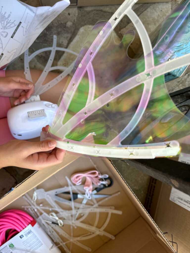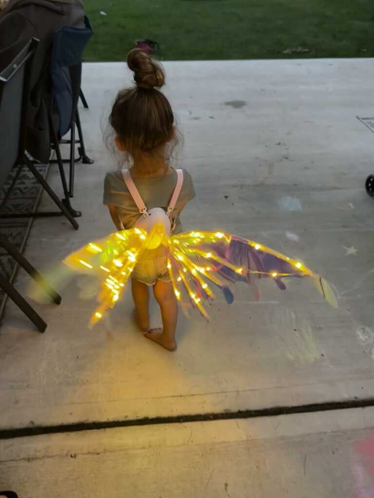 Bellissime ali! Le luci fanno un effetto magico e i movimenti sembrano veri. Il montaggio è un po’ lungo, ma ne vale la pena. Mia figlia di 5 anni è felicissima e non vuole più toglierle.