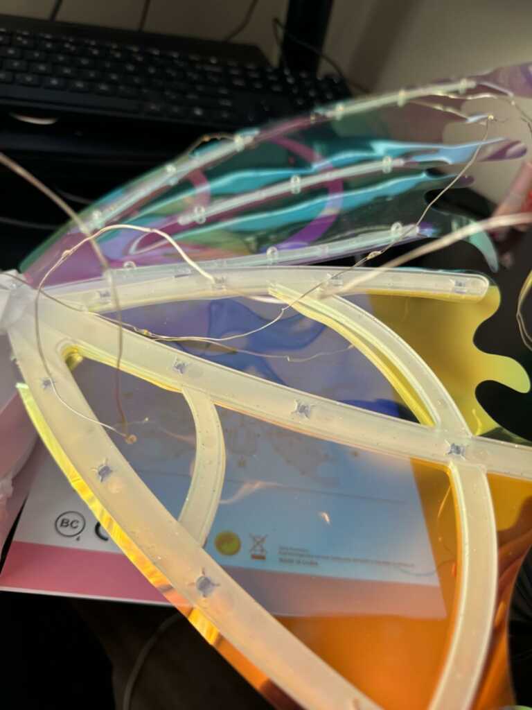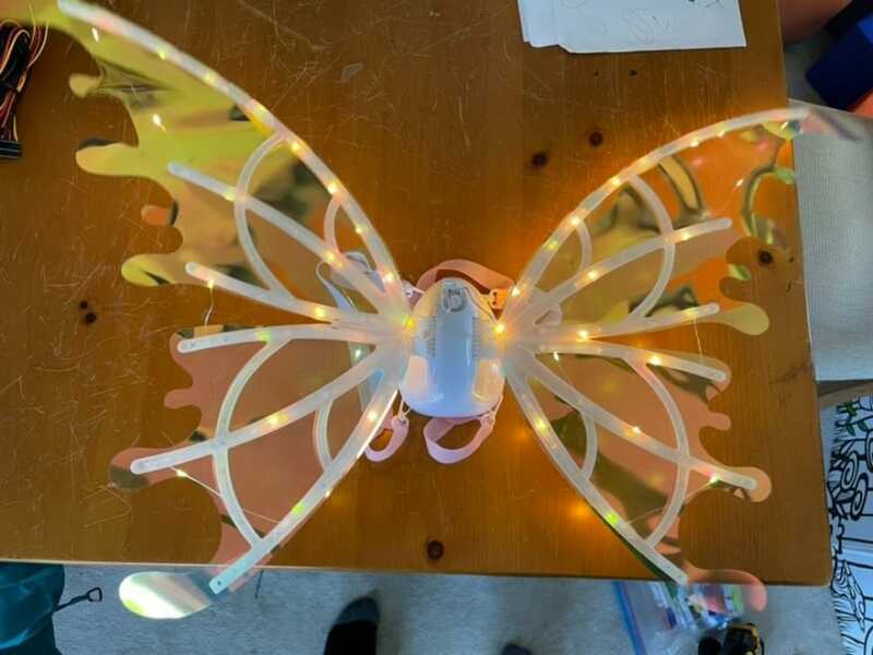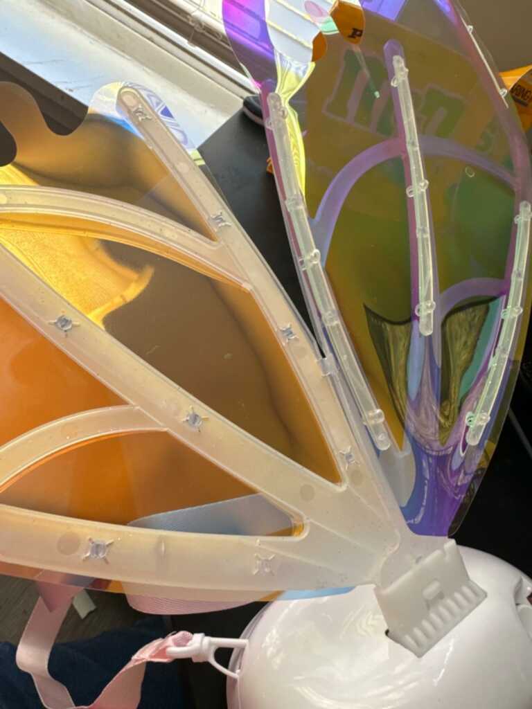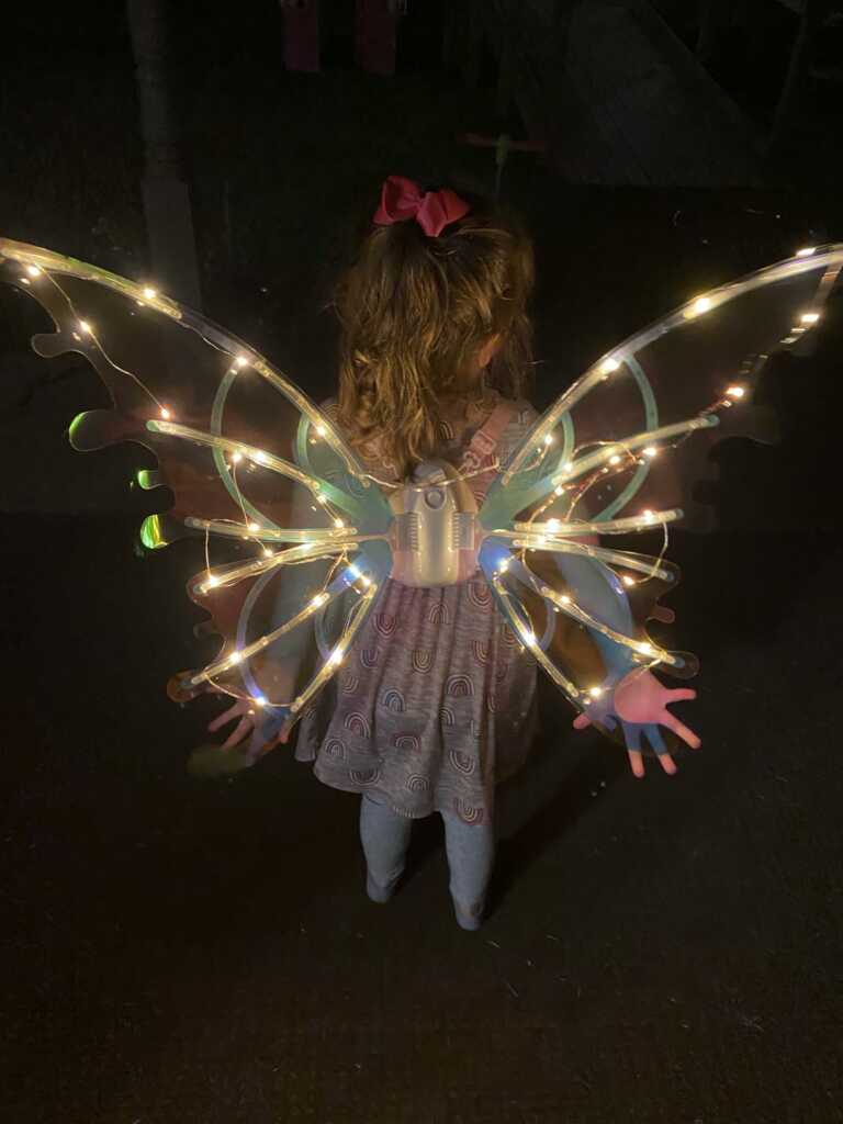 Ali da fata spettacolari! Le luci LED sono bellissime, si possono usare con o senza musica. Il battito delle ali motorizzato è realistico e gli spallacci regolabili stanno bene anche a una bimba di 4 anni. Mia figlia le adora e non vede l’ora di indossarle a Carnevale.
